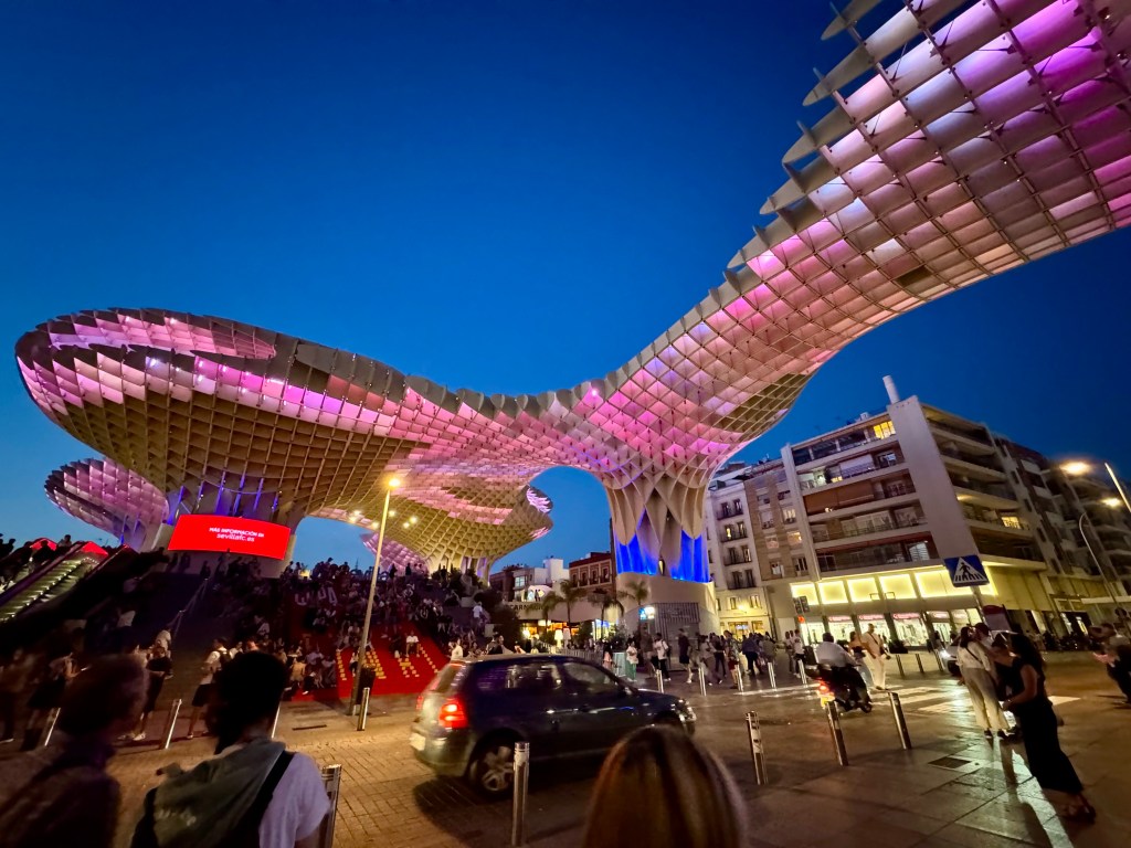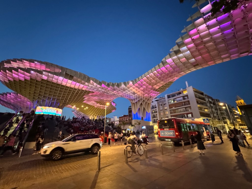 We took a 2 hr break at our apartment. Then headed back out to see the Setas de Sevilla at night.