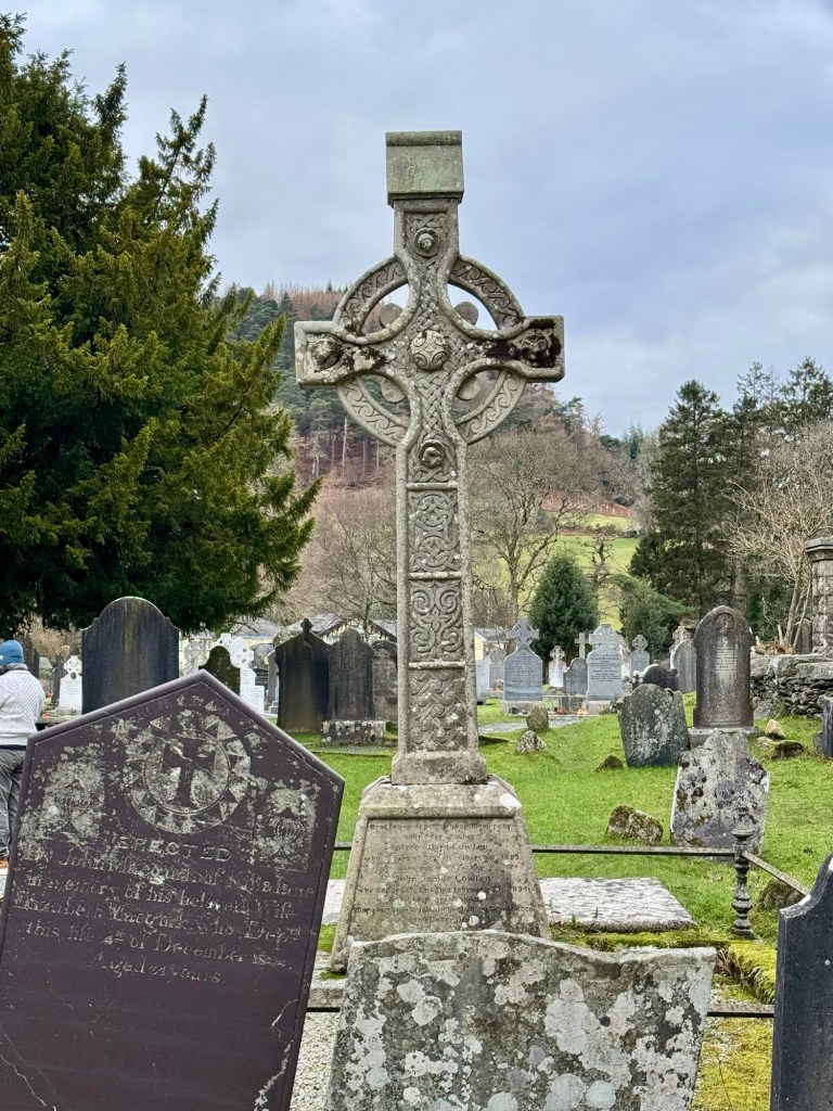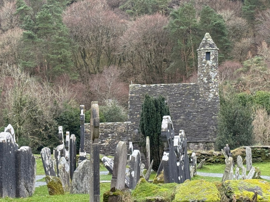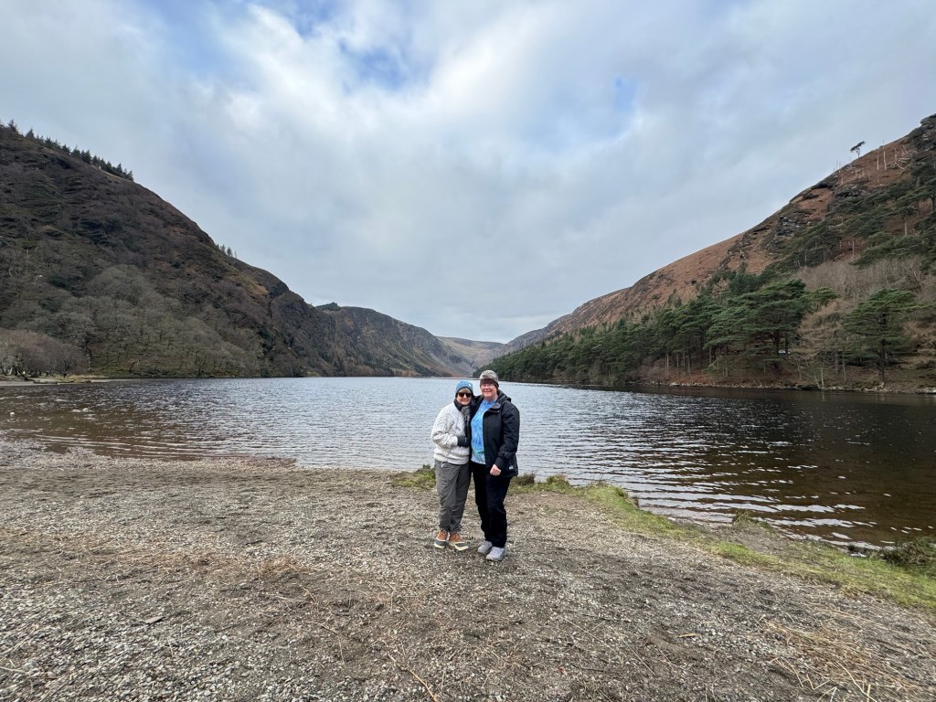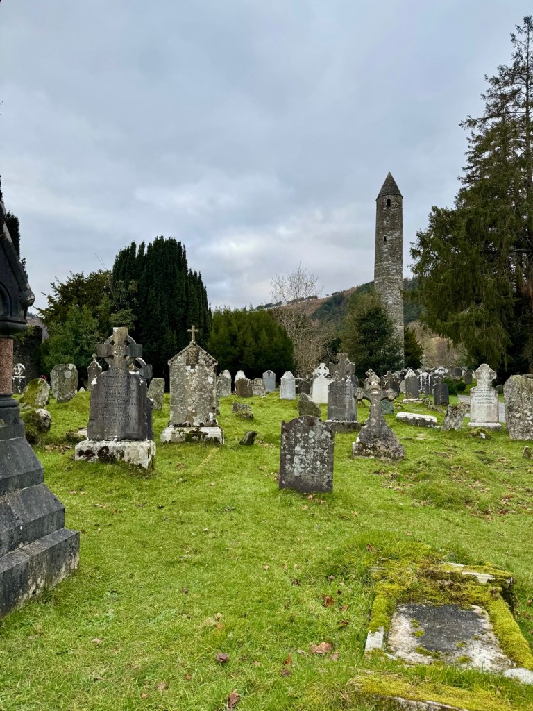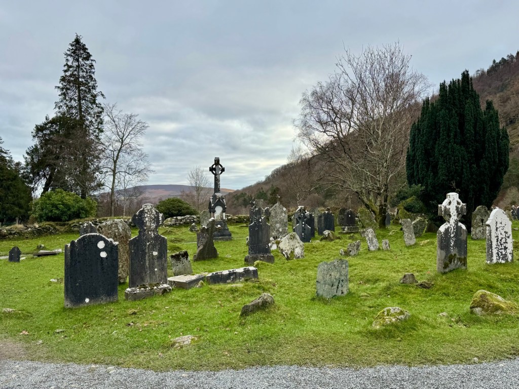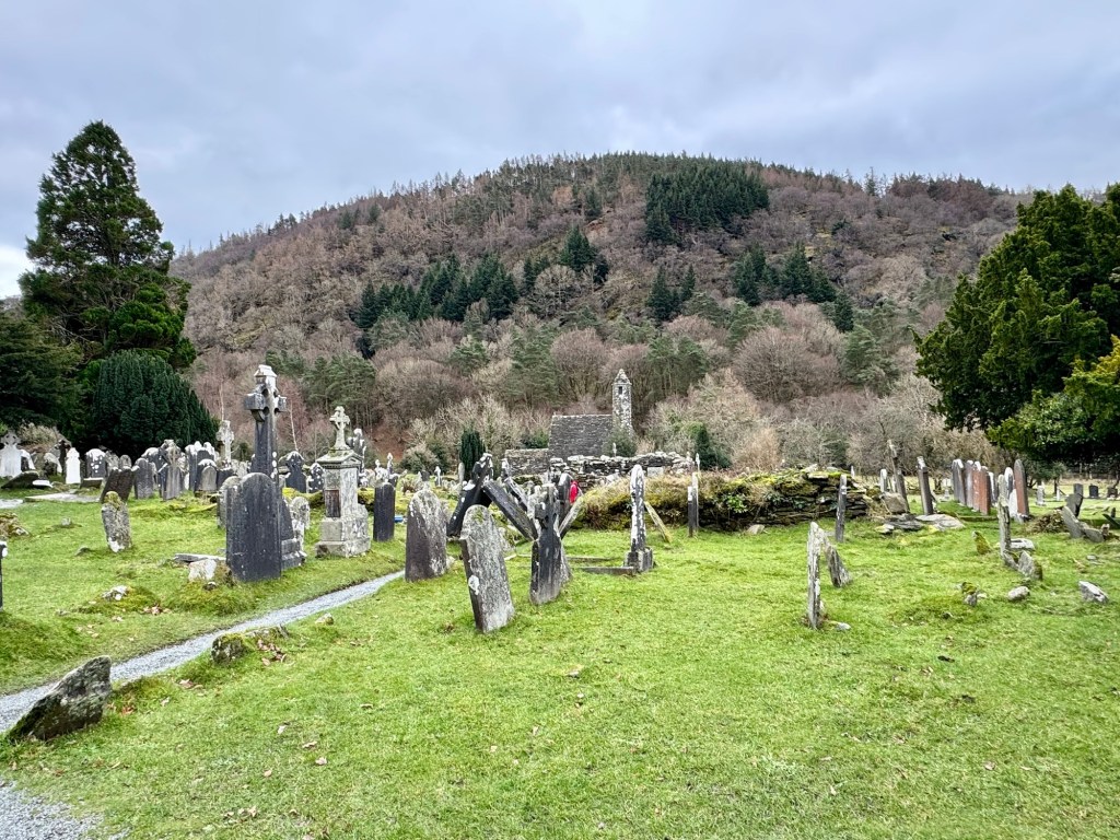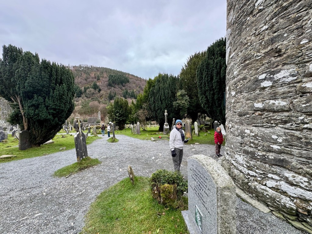My last full day in Ireland (for this trip…lol. Note Mary staying until Jan 13) was busy and good! Myself, Mary, Brent, and Leo ventured out for a ride to Glendalough. Glendalough (“valley of the two lakes”) is located about an hour from Dublin. A Monastic site is located in Glendalough and was founded by St. Kevin. We enjoyed a beautiful car ride through the countryside. There were lots of green rolling hills and sheep-beautiful. We took a walk, had snacks and coffee at the upper Lake. There are many hiking trails in this area. Then we headed to the Monastic site. There were many beautiful Celtic crosses at gravesites, churches and a round tower. The views were gorgeous. The area was serene and though there were many folks there, I felt a calming, quiet peace in this area. Would love to return here for some hiking and some serious grounding. We returned home after a nice ride back through the countryside.