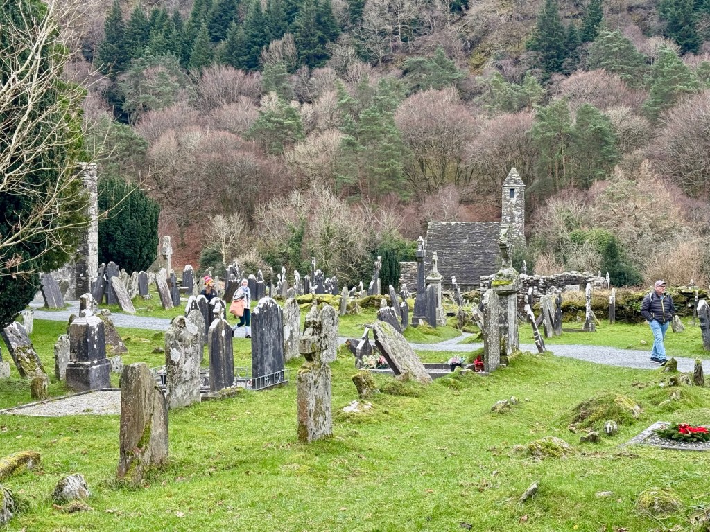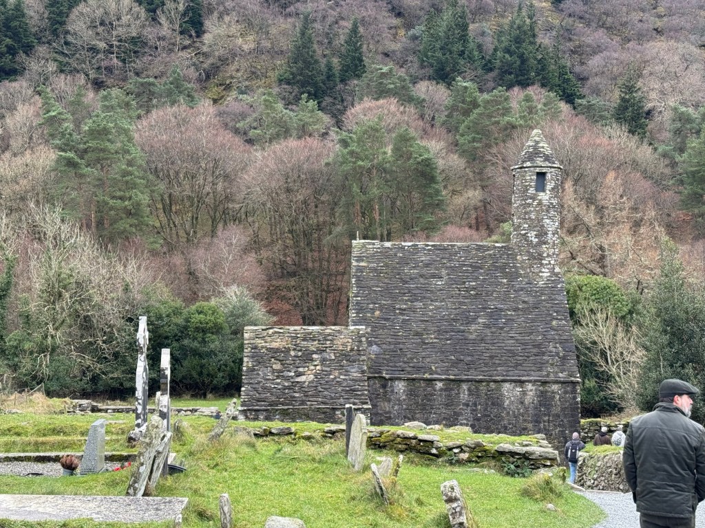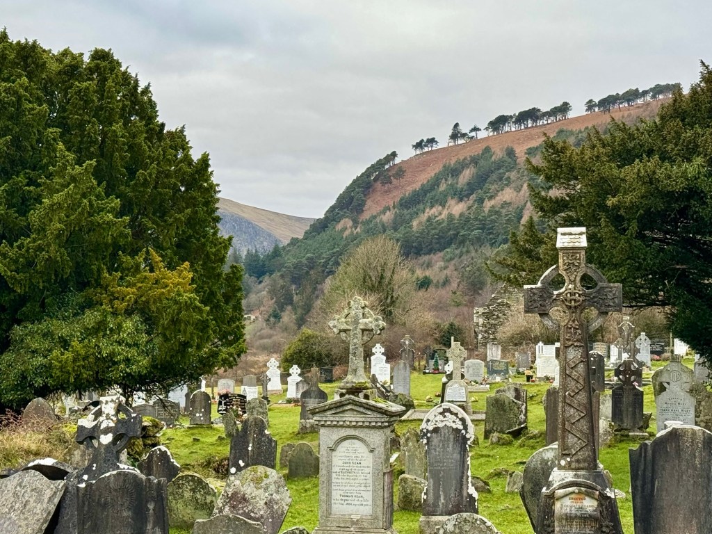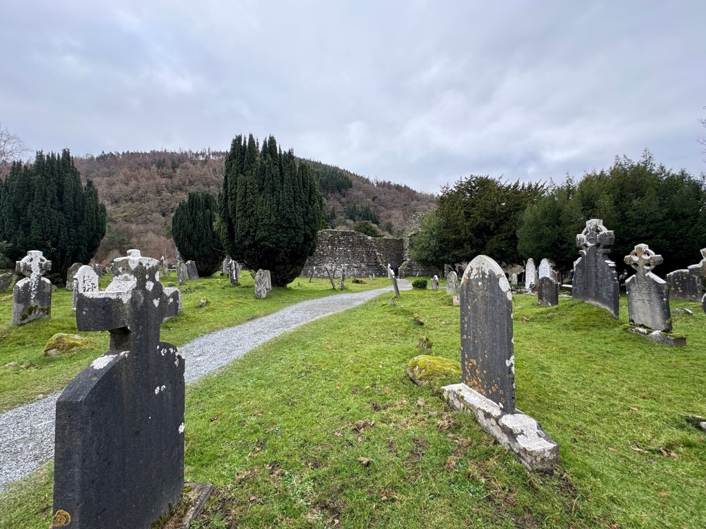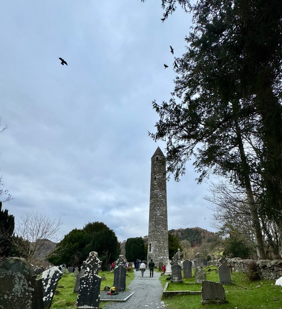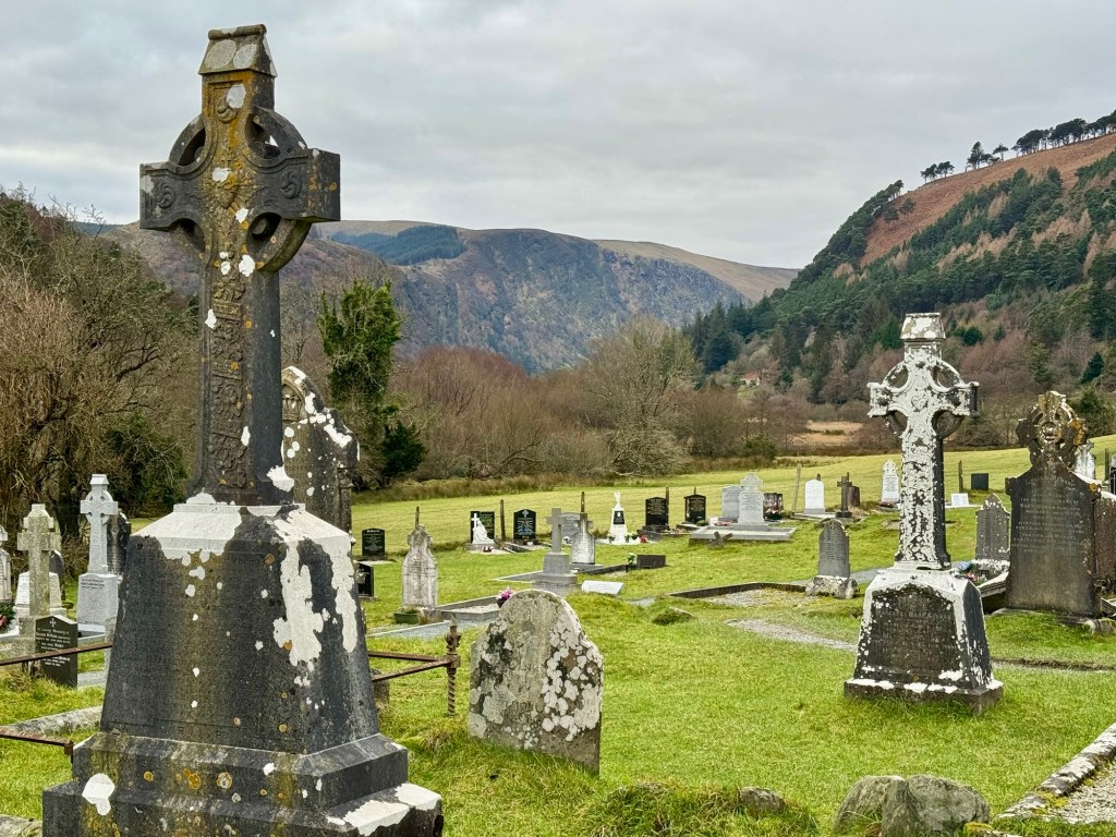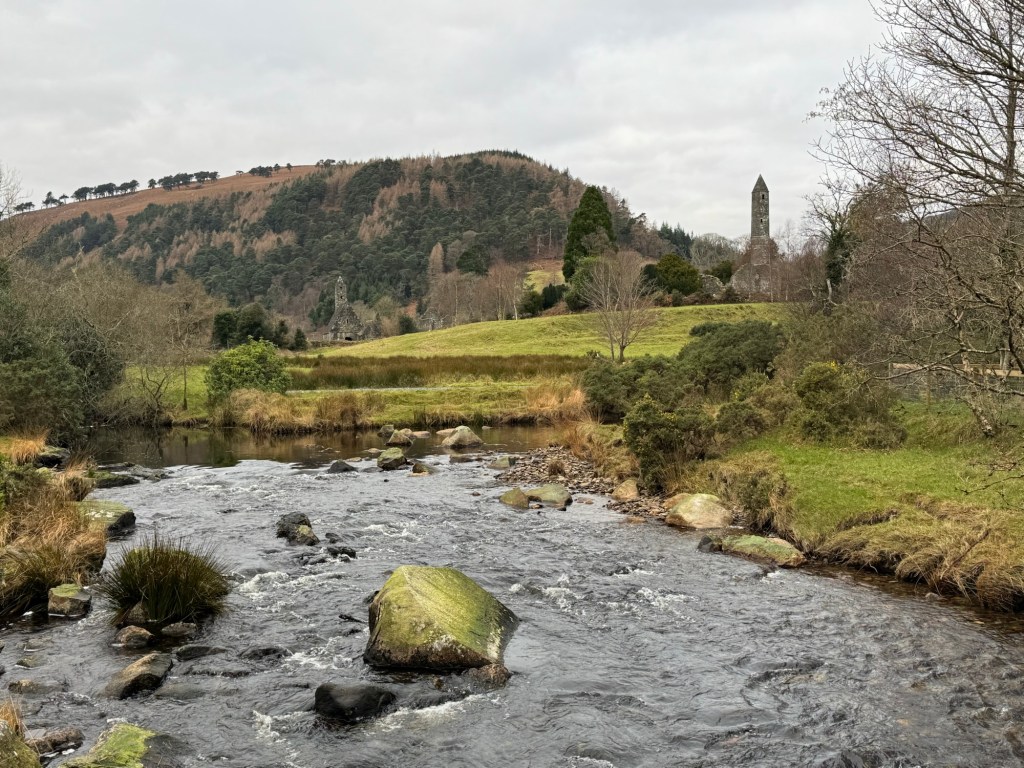 My last full day in Ireland (for this trip…lol. Note Mary staying until Jan 13) was busy and good! Myself, Mary, Brent, and Leo ventured out for a ride to Glendalough. Glendalough (“valley of the two lakes”) is located about an hour from Dublin. A Monastic site is located in Glendalough and was founded by St. Kevin. We enjoyed a beautiful car ride through the countryside. There were lots of green rolling hills and sheep-beautiful. We took a walk, had snacks and coffee at the upper Lake. There are many hiking trails in this area. Then we headed to the Monastic site. There were many beautiful Celtic crosses at gravesites, churches and a round tower. The views were gorgeous. The area was serene and though there were many folks there, I felt a calming, quiet peace in this area. Would love to return here for some hiking and some serious grounding. We returned home after a nice ride back through the countryside.