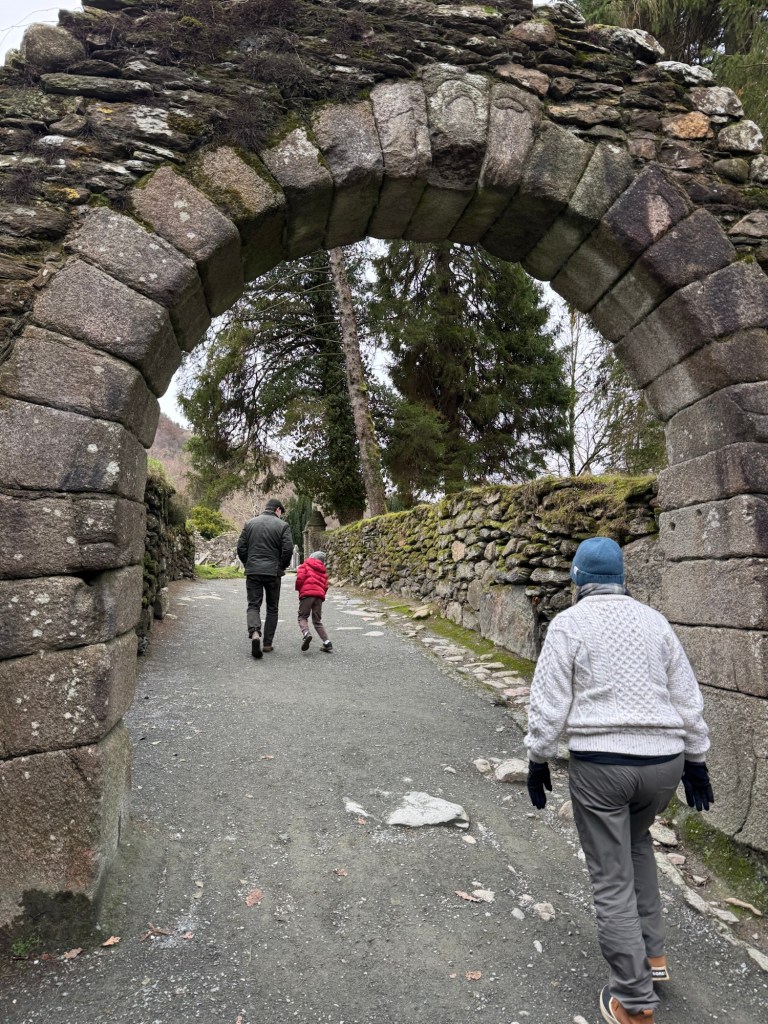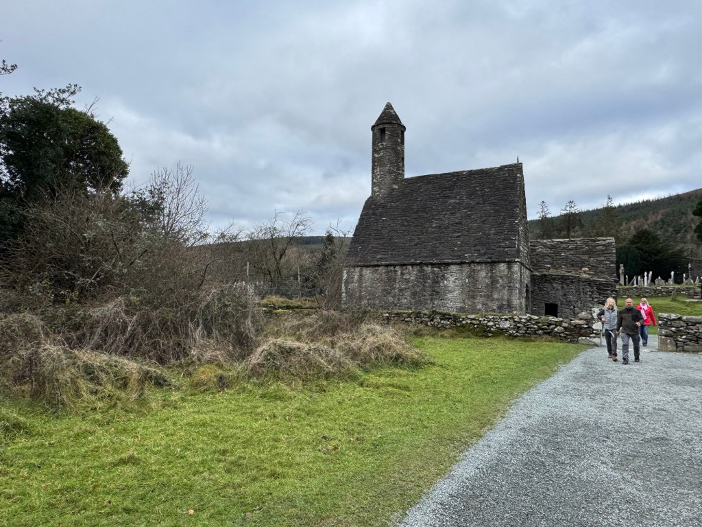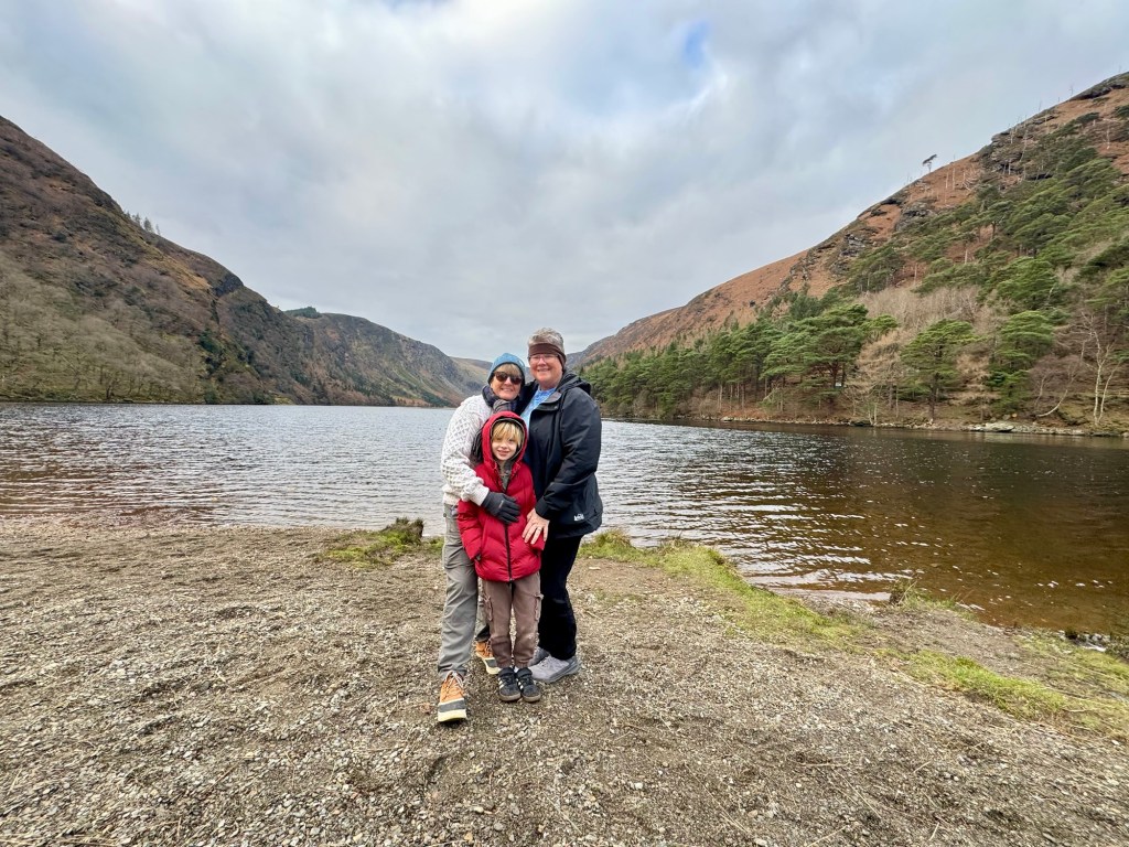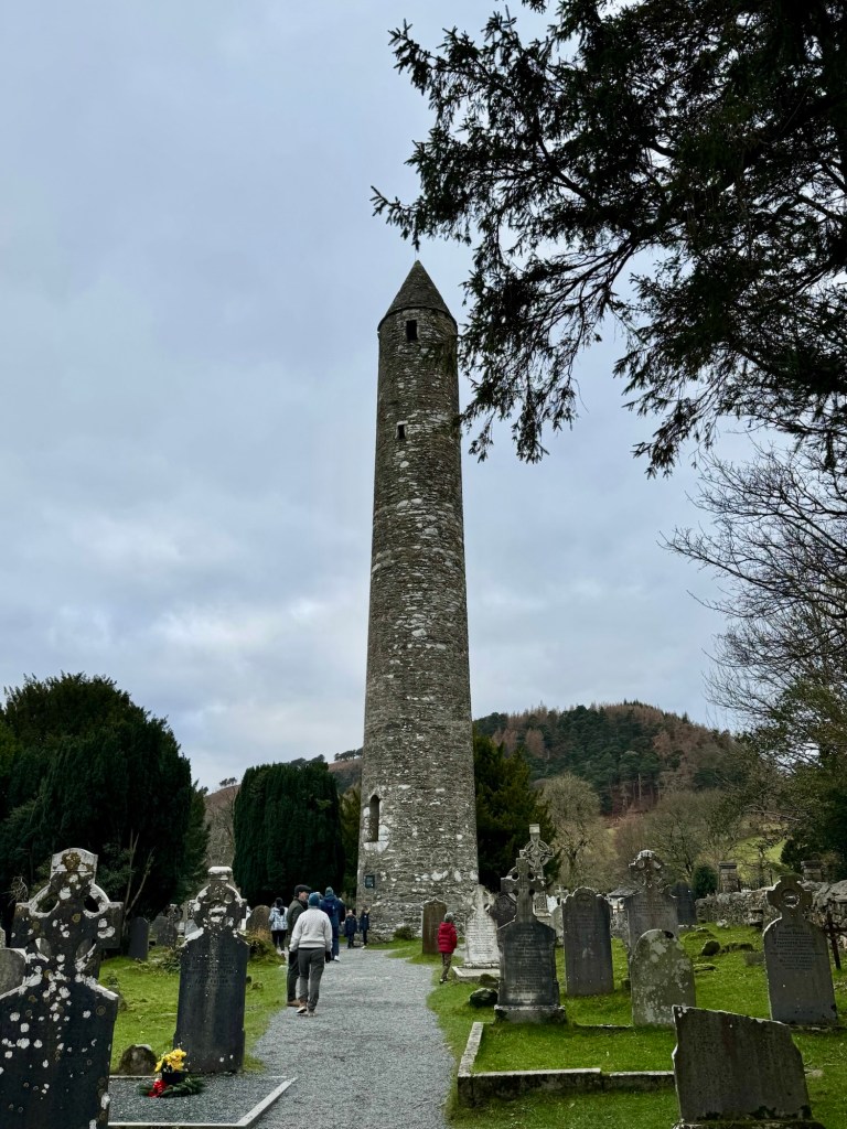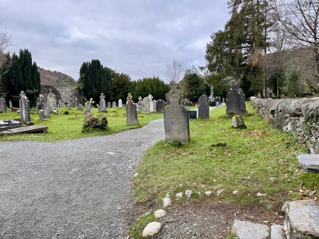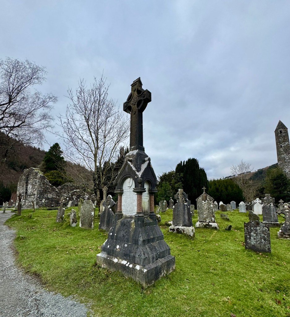 My last full day in Ireland (for this trip…lol. Note Mary staying until Jan 13) was busy and good! Myself, Mary, Brent, and Leo ventured out for a ride to Glendalough. Glendalough (“valley of the two lakes”) is located about an hour from Dublin. A Monastic site is located in Glendalough and was founded by St. Kevin. We enjoyed a beautiful car ride through the countryside. There were lots of green rolling hills and sheep-beautiful. We took a walk, had snacks and coffee at the upper Lake. There are many hiking trails in this area. Then we headed to the Monastic site. There were many beautiful Celtic crosses at gravesites, churches and a round tower. The views were gorgeous. The area was serene and though there were many folks there, I felt a calming, quiet peace in this area. Would love to return here for some hiking and some serious grounding. We returned home after a nice ride back through the countryside.