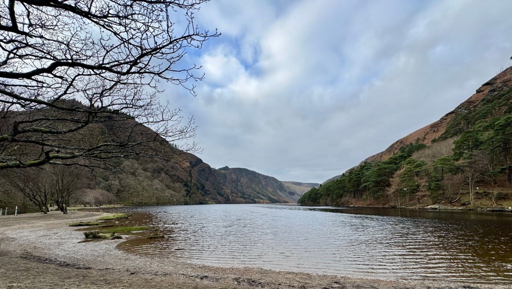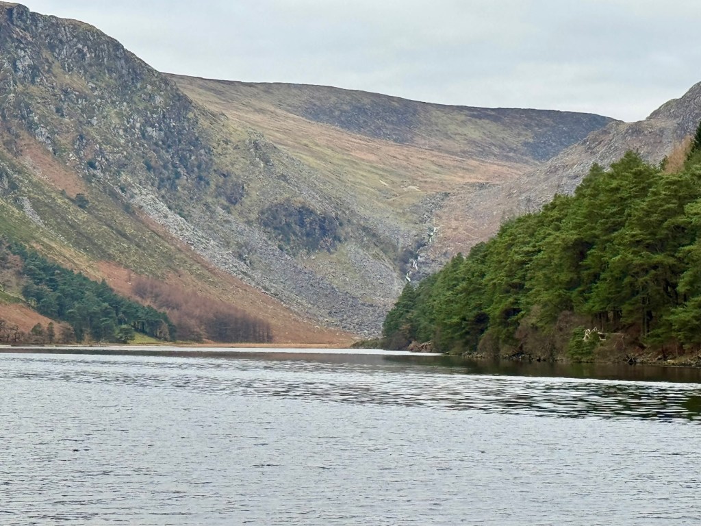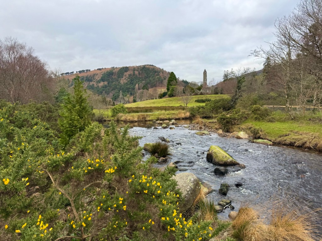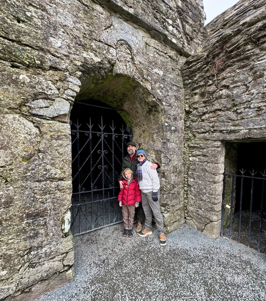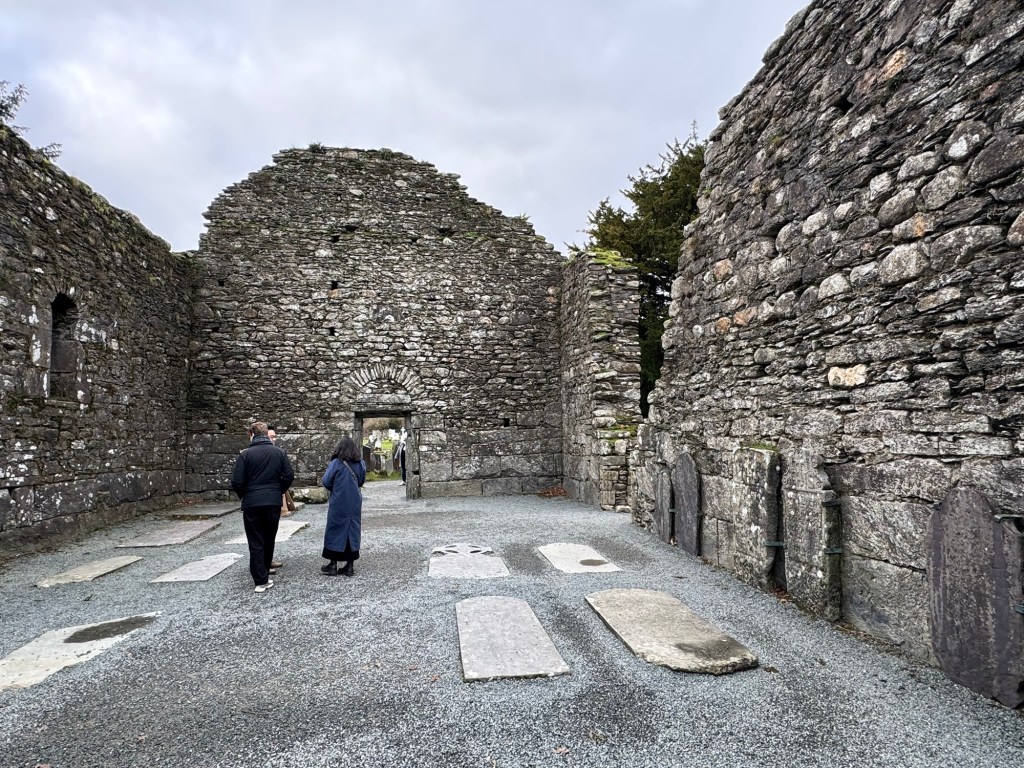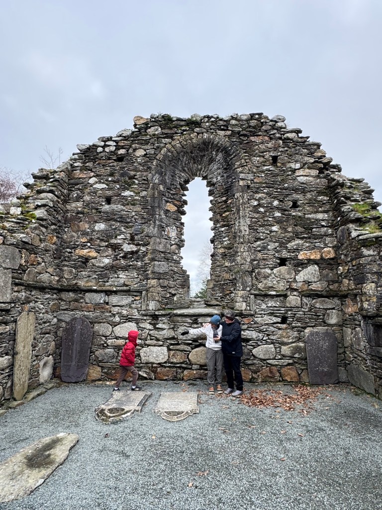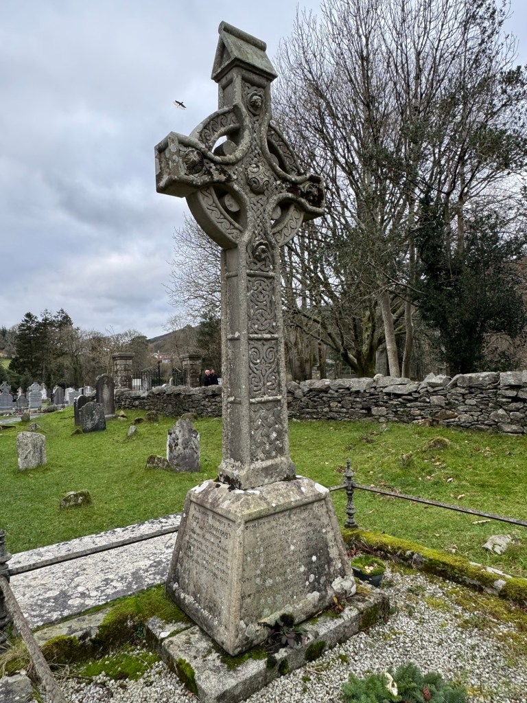 My last full day in Ireland (for this trip…lol. Note Mary staying until Jan 13) was busy and good! Myself, Mary, Brent, and Leo ventured out for a ride to Glendalough. Glendalough (“valley of the two lakes”) is located about an hour from Dublin. A Monastic site is located in Glendalough and was founded by St. Kevin. We enjoyed a beautiful car ride through the countryside. There were lots of green rolling hills and sheep-beautiful. We took a walk, had snacks and coffee at the upper Lake. There are many hiking trails in this area. Then we headed to the Monastic site. There were many beautiful Celtic crosses at gravesites, churches and a round tower. The views were gorgeous. The area was serene and though there were many folks there, I felt a calming, quiet peace in this area. Would love to return here for some hiking and some serious grounding. We returned home after a nice ride back through the countryside.